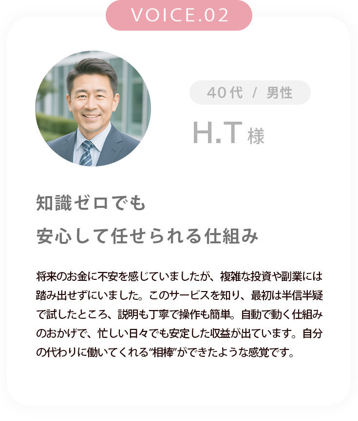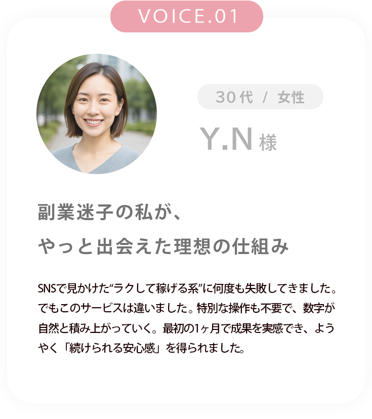 会社員、主婦、自営業の方など、幅広い方が利用されています。特に「時間が取れない」「副業が続かなかった」という人に人気です。